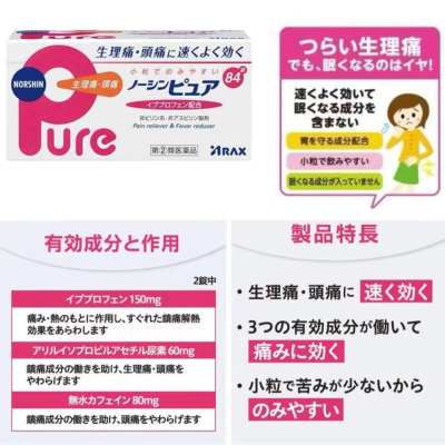 ⭐️Pure止痛藥是含布洛芬成分,可快速抑制引起疼痛和發熱的物質(前列腺素)的形成,並具有優異的鎮痛和解熱作用,另外烯丙基異丙基乙酰脲和無水咖啡因,可增強其療效,是一種鎮痛和解熱藥物。